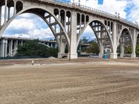 large structure near the roadway with a construction site in foreground area and buildings next to the bridge