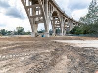 This image shows the construction of an underpass for a bridge in a rural area. The bridge spans a lot of dirt and gravel, with trees in the background. The concrete surface and the gloomy grey sky create a mood of a desolate and quiet atmosphere. This photo captures the process of building an important infrastructure in an open space. The underpass will provide a vital connection for vehicles and pedestrians. It represents the progress and development of rural areas.