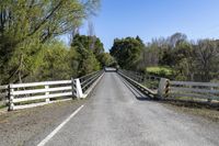 This image captures a scenic rural landscape on a clear day. A straight road stretches through the lush green surroundings, lined with trees on both sides. The road leads to a white wooden bridge with a fence, adding charm to the picturesque scene. This serene nature view showcases the beauty of this rural area and invites viewers to imagine the peacefulness of a drive along this road. The clear sky above complements the vibrant greenery below, creating a harmonious and calming atmosphere.
