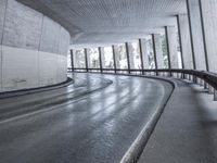 This is an image of a road and bridge in a metropolitan area. The grey sky reflects a gloomy day in the city. The road's asphalt surface is wet, indicating recent rainfall or snowfall. The bridge structure and underpass can be seen, as well as the curve in the road. Guard rails and barriers are present for safety. This photo captures the urban infrastructure and architecture of a modern city. It represents the connectivity and transportation options available in a metropolitan area.