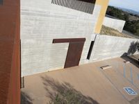 A top-down view of a modern elevated home in rural California. The high concrete walls and gravel surface give the house a rugged yet contemporary feel. This suburban villa showcases the unique architecture of Los Angeles.