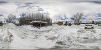 A snowy day in rural Canada, with snow piled in front of a house along the road. Open spaces and clouds create a picturesque winter scene. Explore the shops and storefronts of Montreal and Toronto.