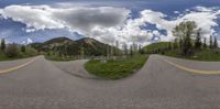 Rural Colorado landscape with straight road lined by aspen trees, leading towards majestic mountains. Cloud-filled sky on a clear day enhances the natural beauty. A quintessential scene of the USA countryside.