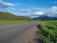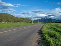 Rural Colorado landscape at dawn, with lush greenery and cropland. Asphalt road leading through mountainous terrain. Clouds scatter the sky as the day breaks over the serene farm lands of the USA.
