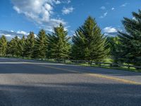 Rural Colorado landscape with lush greenery and aspen trees casting hard shadows. Mountainous terrain contrasts with the asphalt road under the clear USA sky. A typical day in the scenic beauty of Colorado.