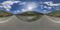 there is a fish eye view of the road in the picture and the hills with rocks in front