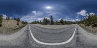 an empty highway is wide and straight with trees on either side of the road and sun shining above