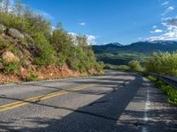 A scenic road in rural Colorado, winding through the landscape with Pikes Peak in the distance. The road curves along the suburban neighborhood, casting hard shadows on the asphalt. A quintessential USA day.