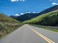 the road is paved with yellow markings and has a snowy mountain range in the background