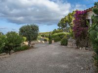 A rural driveway in Majorca, Spain, at dawn. The road leads through open space surrounded by agricultural farms and houses. Clouds fill the European sky on this peaceful morning.