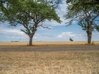 a dirt road is running between some trees in the grass in a field near the water