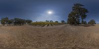 a sky view looking back at a farm field and a clear sun in the sky