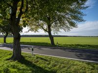 A picturesque landscape in rural Germany. The road surface, covered in lush vegetation and surrounded by fields, leads through a green and vibrant land lot. Autumn colors add a touch of warmth to the scene under the clear European sky.