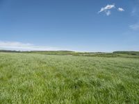 This is a picturesque landscape in Germany, showcasing a vast field of lush green grass. The open space extends towards the horizon, with scattered trees and vegetation adding to the natural beauty. The sky above is filled with fluffy white cumulus clouds, contrasting against the clear blue sky. This rural scene represents the serene beauty of the European countryside, with its agricultural land lots and rich groundcover. The image captures a typical day in Europe, with incidental people enjoying the peaceful surroundings. It is a perfect representation of the harmonious relationship between nature and humans.