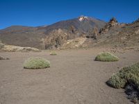 A scenic view of the volcanic landscape in Tenerife, Canary Islands. The rugged terrain is covered with low grass, gravel, and sand. Mountain formations and rocky outcrops create a beautiful and natural off-road track in this national park.