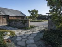 This stock photo features a charming rural home located in Los Angeles, California, USA. The image showcases an open pathway in front of the building, with a slate roof and a stone walkway that leads to two entrances. The pathway is made of cobblestone and dirt, surrounded by a lush green landscape. A stone wall, shed, and farm can be seen in the background. The clear sky and the peaceful surroundings create a serene atmosphere. This photo is perfect for illustrating real estate, property, and rural living concepts.