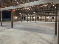 This is a night-time photo of a barn interior in California, USA. The architecture of the building showcases a rustic and rural feel, with wooden flooring and a high ceiling. The space is illuminated by artificial light, creating a warm and cozy atmosphere. The open floor plan allows for a flexible use of the space, whether it be for agriculture or storage. Outside, the clear sky can be seen through the shed windows. This image captures the beauty of the California countryside at night.