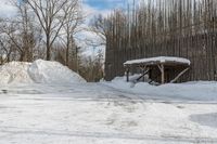This photo captures a charming house located in a rural area of Canada. The house is constructed with wood and is beautifully covered in a layer of glistening snow. Surrounding the house, there are piles of dirt adding a rustic touch to the scene. The image showcases the beauty of a winter day in Canada with open space and clear blue skies adorned with fluffy clouds.