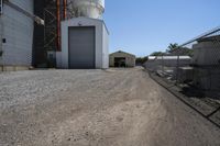 a farm is parked behind a chain link fence near a silo and warehouse building