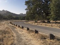 This is a photo of a road in rural California, USA. The asphalt road stretches through a low mountain landscape, surrounded by grassy fields and trees. The clear sky overhead provides a beautiful backdrop for the natural scenery. The road surface is visible, along with the vegetation and soil on the sides. An Armco barrier can be seen along the road, providing safety and protection. This image captures the serene and rural atmosphere of California, with its open fields, scenic landscape, and well-maintained infrastructure.
