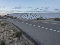 A rural landscape in California at dawn. The road, lined with houses and vegetation, stretches out into the plain. Clear skies above showcase the beauty of nature. A picturesque scene of California's architecture and natural beauty.