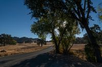 This image captures the beauty of a rural landscape at dusk. The sun shines through the trees, casting a warm glow on the vegetation and grass. A rural road with a smooth asphalt surface runs through the scene, leading to a distant farm. The clear sky above adds to the peacefulness of the setting. This photo showcases the connection between nature and agriculture in a rural environment. It's a perfect representation of a serene day in the countryside.