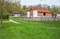 This is an image of a rural property in Ontario, Canada. The photo showcases a road bordered by grass and an asphalt surface. In the distance, there is a house with a fenced courtyard, surrounded by trees. The grey sky sets a moody atmosphere, adding to the tranquility of the landscape. This photo represents a typical day in the rural outskirts of Toronto, where agricultural activities can be observed in the nearby farmland and land lots.