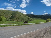 A scenic rural landscape in Colorado, featuring lush greenery and mountainous terrain. The asphalt road winds through the picturesque aspen trees, under a clear sky typical of a day in the USA.