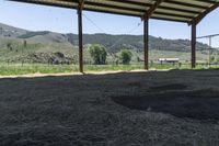 A picturesque rural scene in Crested Butte, Colorado. The outdoor horse stable is surrounded by mountains and open space, with a clear sky providing a beautiful backdrop. The dirt surface, grass, and hills complete the idyllic landscape.