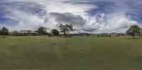 a view of a farm with cows grazing in it and clouds overhead above it that are overcasted and slightly dark