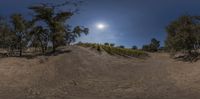 the sun shines brightly on a clear day, while a man rides a dirt bike on a trail