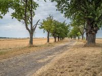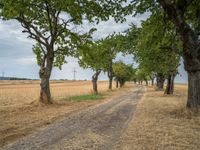 Rural landscape in Europe, featuring a gravel road surrounded by agricultural fields under a cloudy sky. A typical day in Germany's countryside with dirt and sand streets adding to the natural charm.