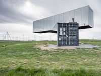 this container is surrounded by grass and wind mills it stands on a hill with a few trees