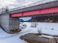 A picturesque rural landscape in Germany. The road winds through open spaces and is framed by towering mountains. Clouds hover over the bridge and underpass, with water glistening in the wet winter scenery.
