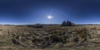 a landscape shot with some large rocks and grass on the ground near a bright blue sky