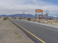 This is an image of a rural landscape in Nevada, USA. The photograph captures a long, winding asphalt road cutting through the vast desert and surrounded by mountains. The clear blue sky is dotted with fluffy white clouds, creating a picturesque horizon. The road surface is smooth and leads to the distant horizon, where a billboard for a restaurant can be seen. The rugged vegetation and land lots add to the natural beauty of the scene. This photo represents the serene and rugged nature of Nevada's countryside.