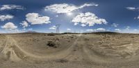 a panorama view of the sun shining over an empty field of dirt and grass with a telephone tower in the background