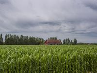 This is an image of a rural landscape on a gloomy day. The grey sky casts a shadow over the open grass field and the tree in the distance. A small house and shed can be seen among the vegetation, creating a peaceful scene of rural life. In the foreground, there is a farm with a barn and land lot. Incidental people can be seen going about their daily activities. This photo captures the gloominess of the day and the tranquility of the countryside.