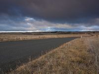 A rural road cutting through a plain landscape. The grey skies and gloomy atmosphere enhance the sense of isolation. The road curves through fields of grass, creating a contrasting visual against the asphalt.
