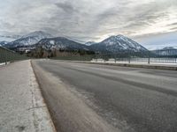 This is an image of a rural landscape in Europe, specifically Germany. The photo captures an open asphalt road that leads to a body of water with snow-capped mountains in the background. The road is wet from the recent snowfall, contrasting with the clear sky and clouds above. This scene represents a typical winter day in Europe, with nature and mountains serving as the backdrop. The bridge in the distance adds to the picturesque view. Experience the beauty of the winter season with this stunning image.