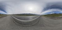 a wide angle image of a road surrounded by mountains and grass in a convex mirror