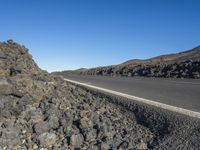 A scenic road in Tenerife, Spain, winding through a volcanic landscape. The empty road stretches out against a clear sky, with rocks and gravel in the foreground. A stunning mix of nature and rugged terrain.
