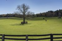 In a rural landscape outside of Toronto, cows and sheep graze on lush green grass in a fenced pasture. The landscape is dotted with trees and farmland, creating a picturesque scene of agricultural beauty.