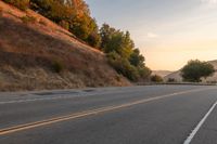 This is a breathtaking image of a lone motorcycle cruising down a rural road at dusk. The vibrant colors of the setting sun illuminate the landscape, casting a warm glow across the vegetation and road surface. The road winds through hilly terrain, providing a scenic and adventurous ride. The clouds in the sky add depth to the picture, giving it a dramatic and awe-inspiring feel. This photo captures the beauty of nature and the thrill of a motorcycle ride in a rural setting.