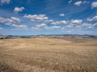A scenic view of an empty field full of dry grass with clouds in the blue sky above it and hills on the far side. This tranquil rural landscape in Tuscany, Italy showcases the rugged beauty of the European countryside. The open space, surrounded by gravel roads and dirt paths, offers a perfect setting to appreciate nature and the clear sky. The image captures the essence of a peaceful day in the midst of harvest season, reminiscent of a beautiful garden in the heart of Europe.