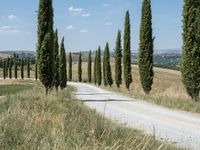 This stock photo captures a scenic rural landscape in Tuscany, Italy. The image features a dirt road winding through a picturesque countryside. The rugged terrain is complemented by a beautiful clear sky, creating a stunning view of nature. The gravel path leads to a tranquil garden filled with cypress trees. This idyllic spot in Europe is known for its picturesque landscapes and bountiful harvests.