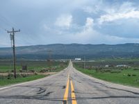 Endless road stretching through the rural landscape of Utah. Lined with fields and framed by the clear blue sky and fluffy white clouds. A perfect day for a drive in the USA.