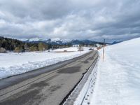 A scenic winter road in rural Germany, covered in a quarter inch of snow and surrounded by snowy fields. The road is wet, with water reflecting the clouds in the sky. This picturesque landscape captures the beauty of nature in Europe during the winter season.