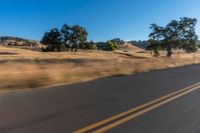 This is an image of a rural landscape with a road running through it. The road surface is made of asphalt and is flanked by trees on either side. The clear sky overhead adds a touch of blue to the scene. The vegetation, including the grass and land lot, showcases the agricultural nature of the area. A person can be seen riding a bike on the street, enjoying the peacefulness of the countryside. This photo captures a beautiful day in a rural farm setting.