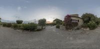 A rural Majorca road at dawn, surrounded by open fields and farm homes. Clouds break of day over the Balearic Islands. Straight driveway leading to a paver road in Spain's countryside.